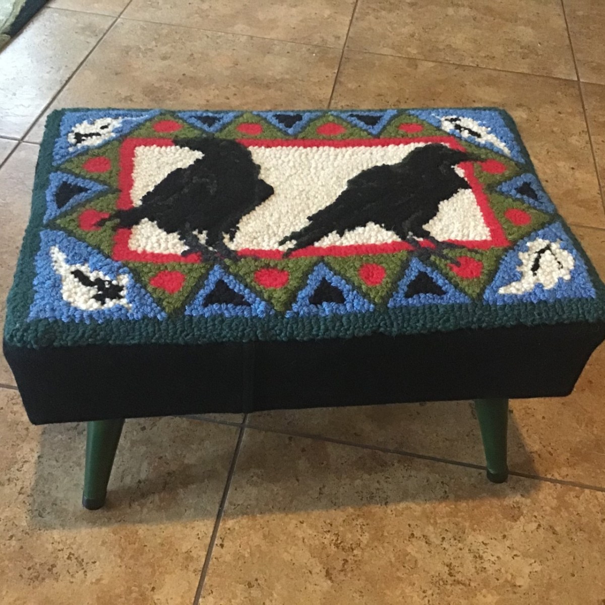 Sharon P. – foot stool.. removed the old vinyl and covered with the crow pattern rug.. the sides are from a wool coat, taken apart, washed to shrink. Inspiration for the design from photos that I took in London last year Of a crow sitting on a cannon.